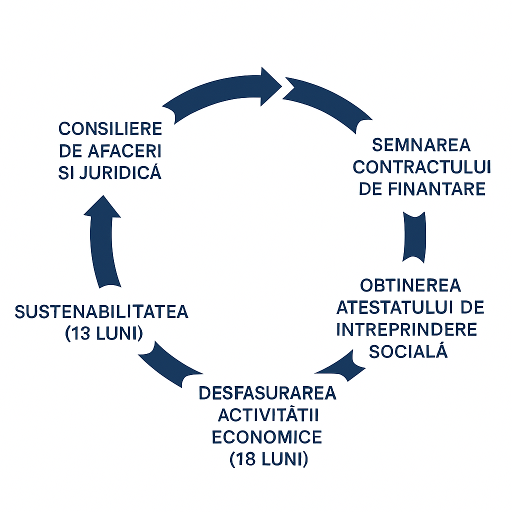 Odată ce un plan de afaceri este declarat câștigător în cadrul competiției organizate prin proiectul „Step by step în antreprenoriatul social” (cod SMIS 312268), urmează o perioadă intensă, dar bine structurată, de transformare a ideii în realitate. Proiectul, cofinanțat de Uniunea Europeană și Guvernul României prin Programul Incluziune și Demnitate Socială 2021–2027, oferă sprijin concret și etapizat câștigătorilor de la competiția planurilor de afaceri.
